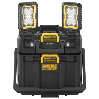General description Illuminate your work areas and ensure that your essential tools are always within reach with the DEWALT® TOUGHSYSTEM® 2.0 Adjustable Work Light with Storage. This cutting-edge lighting solution is powered by 18V batteries and features two pivoting LED heads that provide up to 3 hours of continuous illumination. In addition to its outstanding lighting capabilities, this modular work light offers ample storage space, a convenient integrated folding handle, and a rugged design that is fully compatible with the TOUGHSYSTEM® platform, making it the perfect choice for demanding jobsites. Technical specifications Product Width: 30 cm Product Height: 36 cm Product Length: 40 cm Product Weight: 4830 g Gross Weight: 4960 g Voltage: 18 V Power: 40 W Bulb type: LED Number of Pieces: 2 Power Source: Cordless Packaging: Sleeve Compatibility and accessories Compatible with TOUGHSYSTEM® 2.0 modules Can be stacked and secured with other TOUGHSYSTEM® 2.0 modules using patented