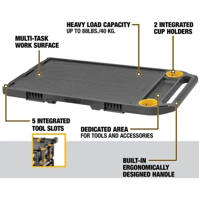 General description This DeWALT DWST08550-1 TOUGHSYSTEM 2.0 DXL Worktop is designed to work seamlessly with all ToughSystem modules and cases. It features integrated surface markings for quick measurements, space for smaller accessories, and a clip space for hanging power tools, making it an ideal addition to your workspace. Technical specifications Load capacity: 40 kg Compatibility: All DEWALT TOUGHSYSTEM 2.0 products Compatibility and accessories Compatible with TOUGHSYSTEM 2.0 DXL Drawers and other TOUGHSYSTEM 2.0 modules (sold separately) Usage Integrated slots for hanging power tools and accessories Mount 2X4 beams or integrate plywood using screw holes to expand the work surface Two integrated cup holder areas for beverages or small accessories Other information Wide, built-in handle for easy mobility Designed for smooth maneuverability around the job site