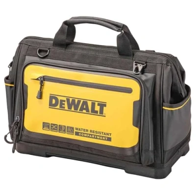 General description The Dewalt DWST60103-1 Pro 16" Open Mouth Tool Bag is designed for enhanced organization with 19 pockets and 12 loops, making it ideal for professionals and DIY enthusiasts alike. Constructed from high-quality, dirt-resistant, and durable fabrics, this tool bag features reinforced stitches for added strength. It includes a waterproof injected plastic base that helps maintain cleanliness while working on-site. The bag also boasts an IP54 water-resistant welded compartment with an innovative zipper protector for secure storage. Technical specifications Material: 1680D durable fabric Water-resistant rating: IP54 Usage Designed for on-site work, the bag keeps tools organized and easily accessible. Features designated solutions for tools and a free-standing storage solution. Includes a tape measure clip and a metal carabiner for quick component connections. Comfortable shoulder straps and back straps allow for easy attachment to vertical handles.