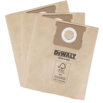 General description Dust bags designed for DEWALT vacuum cleaners, providing easy attachment for minimal interruption during cleaning. Suitable for dry debris collection only. Technical specifications Material: Paper Compatible with DEWALT vacuum models: DXV20P, DXV20S, DXV25S, DXV30SA, and corresponding PRO/PTA series Flexible hose diameter: 48 mm Installation Attach the dust bag securely to the vacuum's inlet port Ensure the bag is properly seated before use Usage Use for dry collection of dust and debris Replace the bag when full to maintain optimal vacuum performance