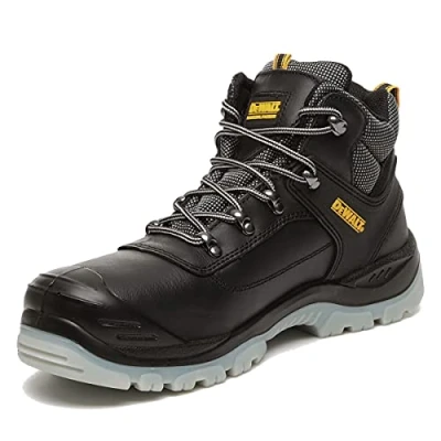PREMIUM PROTECTION AND COMFORT: Full buffalo leather upper provides durability and flexibility. Steel safety toe cap and midsole offer comprehensive protection against impacts and punctures. Padded tongue and collar enhance comfort during long work hours. CERTIFIED SAFETY FEATURES: Meets S1P SRC safety standards, ensuring protection against static electricity, fuel oil resistance, and excellent slip resistance on various surfaces. Ideal for construction sites, factories, and other hazardous work environments. ENHANCED DURABILITY: Reinforced heel and toe areas increase the boot's lifespan, particularly in high-wear zones. PU/TPU injection-moulded outsole offers superior traction, shock absorption, and resistance to abrasion, making it suitable for rough terrains. BREATHABLE COMFORT: Aerospacer lining promotes air circulation, keeping feet cool and dry throughout the workday. This moisture-wicking feature helps prevent discomfort and odor, even during intense physical activities. Note: Not designed for water resistance. VERSATILE WORKWEAR ESSENTIAL: 5" mid-cut design provides ankle support without restricting movement. Suitable for various trades including construction, manufacturing, and logistics. DEWALT quality ensures reliability and performance in challenging work conditions.