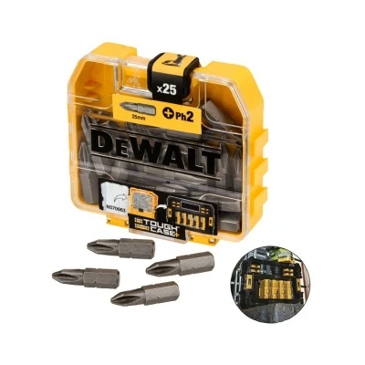 General description Tough quality professional screwdriver bits designed for repetitive screwdriving tasks. The DeWalt DT71522-QZ 25mm PH2 bits are especially suited for driving fasteners into wood, metal, plastic, and drywall materials. This set includes 25 pieces of 25mm PH2 standard bits, supplied in a handy Mini ToughCase. Technical specifications Type: PH2 Length: 25mm Quantity: 25 bits Compatibility and accessories Compatible with the DT70716 T-stak Caddy Fits in the TSTAK® storage system for easy storage Small Bulk Storage case fits inside small, medium, and large cases Usage Ideal for driving fasteners into various materials including wood, metal, plastic, and drywall Optimized tip geometry for full fitment in fasteners and reduced cam-out Flexible torsion zone absorbs torque peaks and reduces breakage (Torsion bits only) Extra grip ribs reduce slipping (specific bits only) Other information This display contains 21 Tic Tac boxes, each containing 25 x PH2 25mm bits