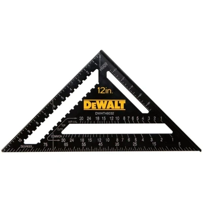 General description The DeWalt 12-inch (300mm) square is a durable and versatile tool designed for precise measurements and markings in carpentry and roofing projects. Its robust construction and multiple functions make it suitable for both professionals and DIY enthusiasts. Technical specifications Material: Extra-thick extruded aluminum body for heavy-duty use Size: 12 inches (300mm) Graduations: Contrasting color markings for easy readability Base: Large, stable base for better grip on materials Pivot point: Facilitates marking of angles Angle scale: Graduations at 1-degree intervals for precise angle measurement Compatibility and accessories Suitable for use as a saw guide Compatible with marking various types of rafters, including common, jack, hip, and valley rafters Installation No specific installation required; simply place the square on the material for measurements and markings. Usage Use the markings to measure and mark straight lines, angles, and parallel lines from edges