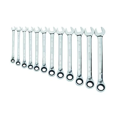 72 teeth of the ratcheting wrench set provides 5 degree arc swing Full Polish Chrome Stamped hashmark pattern on wrench handle provides added grip points Sizes stamped twice on both sides of wrench handle for easier size identification 15 degree offset open end allows an increased range of arc swing in tight spaces DirectTorque(TM) Technology helps prevent rounding of fasteners Stamped markings provide permanent visibility and prevents wear over time