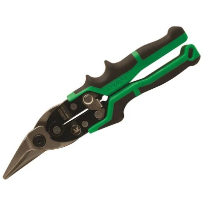 General description DEWALT Right Cut Ergo Aviation Snips are designed for durability and ease of use. Made from forged chrome vanadium steel, these snips feature a serrated cutting edge that prevents materials from slipping during use. The external latch design enhances usability, while the slip-resistant, bi-material cushion grip provides a firm and comfortable hold. With a reduced handle span, these snips require 15% less muscle effort compared to traditional snips, making them ideal for cutting tough materials. Technical specifications Material: Chrome vanadium steel Cutting capacity: Suitable for 18 to 22-Gauge sheet metal Applications: Aluminium, vinyl siding, screening, cardboard, leather, and copper