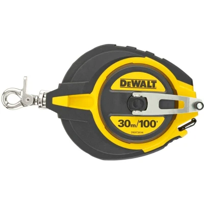 General description This DeWalt DWHT0-34144 Steel Long Tape Measure is designed for precision and durability, featuring a 12mm mylar-coated blade with both metric and imperial graduations for accurate measurements. The corrosion-resistant blade ensures longevity in various working conditions, while the stainless-steel crank arm enhances robustness for demanding job sites. A dirt removal window allows for easy cleaning and maintenance, making it a reliable tool for professionals and DIY enthusiasts alike. Technical specifications Blade Length: 30 meters / 100 feet Blade Width: 12mm Compatibility and accessories Compatible with standard tape measure accessories Includes a spring-loaded carabiner for easy carrying Installation No installation required; ready to use out of the box Usage Extend the tape to measure distances accurately Use the blade-release button to control retraction Attach the carabiner to a belt or tool bag for portability