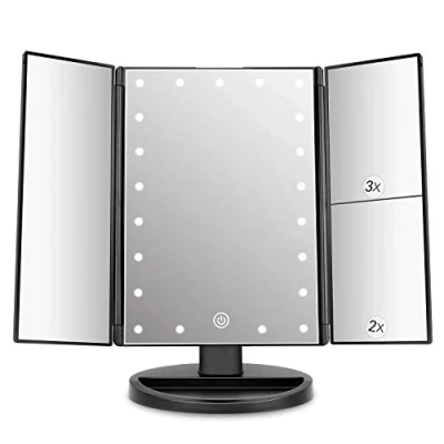 Built in 21pcs LED lights,which is intelligent to adjust brightness by touch sensor switch, long press to dim the light.You can make up you in poorly light or dark areas, without disturbing others. Dual power supply mode:Operated by Micro USB cable supply or 4AAA batteries( battery not included, usb wire included) , pls noted the mirror can't store power by itself. 180°swivel rotatable, can be fixed at any position as needed, 3 panels vanity mirrors provided with wide angle viewing Side-view mirror panels adjust for custom viewing.3X/2X/1X Magnification used together for perfect makeup, you can see the tiniest beauty details,great for grooming brows,applying eyeliner,and tweezing.And the Base Recess can hold jewelry or cosmetics like watch, earrings, bracelets, etc. Perfect gift for ladies and girls Made from premium ABS material and mirror glass,perfect looking and resistance for scratch.