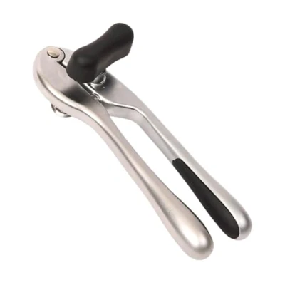 sharp stainless steel cutting blade soft, anti-slip handles that absorb pressure to give extra strength when piercing a can The oversized turn-handle easily lifts the lid away. Made from zinc aluminimum durable and hard wearing Dishwasher safe