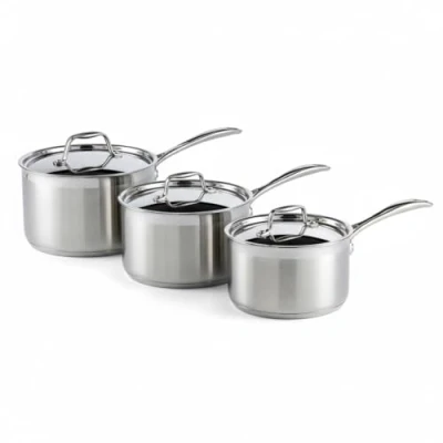 AmazonComprises 16/18/20cm saucepans with lids Deep 18/10 stainless steel bodies 7mm impact-bonded capsule bases 18/10 heavy cast stainless steel handles with heavy duty rivets Suitable for all cookers Dishwasher safe