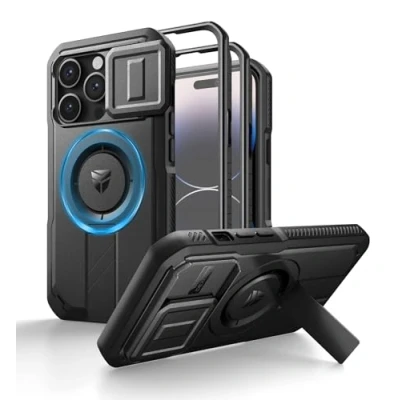 Pay attention to the Compatibility: This adventure-proof case is specifically designed for iPhone 14 Pro, offering precise cutouts for seamless access to all buttons and ports. Please check your phone model carefully before making the purchase. Mighty Magnetic power: With a magnetic hold of up to 1,400g, this rugged case keeps your phone securely attached to all Magnetic accessories. Whether it's a wireless charger or a car mount, it ensures your phone stays put and safe in any situation. MAG-tech slide camera cover: The camera cover is upgraded with magnet-repulsion technology, which not only offers exceptional lens protection against scratches and damage but also allows you to smoothly flick it open for quick shots on the go. Adjustable metal kickstand: Made from superior aluminum alloy, the adjustable stand is incredibly sturdy and long-lasting. It holds your phone securely in both landscape and portrait modes, ensuring great stability and convenience for hands-free viewing. Military-grade protection: Engineered with shock-absorbent TPU bumpers and a robust PC back, this bumper case safeguards your phone against drops and impacts even on the toughest trails, offering unparalleled peace of mind during outdoor adventures.