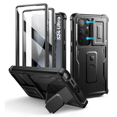 【Designed for Samsung Galaxy S24 Ultra only】. This rugged case comes with precise cutouts for easy access to every port, button, and other functions, and it supports wireless charging and wireless PowerShare. To avoid any compatibility issues, please check your phone model carefully before making the purchase. 【Drop your worries】. With a dust-proof slide camera cover and 10ft military-grade protection, there's nothing to worry about even if you get your phone dropped on the most rugged trail. This bumper case will keep it 100% protected and offer you a carefree experience during hiking, camping, fishing, or any outdoor adventure. 【2 ways to armor up the screen】. One front frame comes with a responsive, scratch-proof PET screen protector (works with touch ID, too). Or, if you prefer using your own screen protector, pop it into the second front frame. With these choices and the added protection of raised edges, keeping your screen safe just becomes a breeze. 【A kickstand, also a ring holder】. Prop up the kickstand and enjoy your TikTok time in portrait mode or binge-watch your favorite shows in landscape mode. If you're worried about your phone slipping while snapping pics outdoors, just slide one of your fingers through the stand for a secure one-handed grip. 【Adventure-ready durability and portability】. Despite being super durable, tough, and protective, this full-body rugged case is still light and portable. Take it along wherever you go, it'll shield your phone from every possible angle and allow more possibilities for you to experience every adventure.