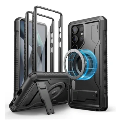 Dexnor Magnetic Case for Samsung Galaxy S24 Ultra with Adjustable Kickstand & 2 Front Frames Built in Screen Protector, MagSafe Compatible Rugged Shockproof Full body Protective Cover Black