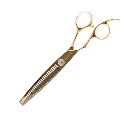 DezynaDog Aureus Blending Scissors Originating from a golden coin of Ancient Rome - a brand-new, high-end scissor range from grooming experts DezynaDog. This range of scissors will add a golden touch to every cut, achieving that perfect groom. Manufactured from high-quality Chinese VG10 Stainless Steel with a hardness rating of 62-63, these scissors retain a perfect sharpness, allowing you to achieve golden grooms for longer. The convex edge finish allows for soft cutting, leaving you with a smooth, professional cut from every angle. Aureus Blender Scissor Range Designed to blend long and short coats, creating unique and seamless styles, these Blenders from DezynaDog combine expert craftsmanship with unmistakable style. Stylish in both looks and functionality, these blenders create a beautiful finish, easily trimming coats to create beautiful pets. Level 3 Scissors · VG-10 Stainless Steel · Blending Scissor · Hardness rating: 61 · Ball bearing screw · Silver petal tension screw · Removable finger inserts · Professional dog grooming scissors Scissor Types Safety – A small grooming scissor for dogs with straight-edged blades but a rounded tip to avoid punctures. Particularly useful for more delicate work in intricate areas. Straights – The original scissor; primarily designed to cut away large quantities of hair as efficiently as possible! Curved – 2 straight-edged blades but designed at a curve. Useful for a variety of situations, rounded styles, intricate areas or anything else that requires some more curves. Thinners – Two blades with teeth – perfect for thinning the coat, not necessarily cutting! Blenders – One straight-edged blade accompanied by a toothed blade – Perfect for blending to create well-balanced styles. Chunkers – Blenders but with thick gaps between the teeth. Perfect for styling and creating angles when you need a softer cut than a straight can provide. Designed for coats with volume. Scissor Levels Level 1: Entry-level scissors – designed to remain sturdy and sharp for as long as possible. Best for those new to scissoring. Level 2: Professional-level scissors – Designed with durability and everyday use in mind. Great for professional backups or groomers just starting out. Level 3: Professional-level scissors – Designed to provide a high-quality finish while remaining durable for everyday use. Level 4: Elite-Level scissors – Made to the highest standards to provide a beautiful finish and expert cut. Level 5: The highest level of scissors – Designed to create the finest finish.