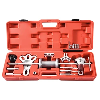 5 lb slide hammer puller tool in polished chrome finish, Pulls flange-type rear axles and most front-wheel drive hubs. Internal and external jaws provide a variety of combinations to pull bearings, gears and seals, Two - and three-way cross blocks and cone provide the perfect jaw configuration for most jobs. Set also includes a grip wrench adapter and a dent puller attachment for sheet metal or other unique pulling requirements. This Slide Hammer Puller kit is ideal for use within the automotive industry for pulling bearings, gears and front wheel drive axle shafts. This nine-way sliding hammer device is also designed for other 5/8"-18 threaded sliding hammer. Slide hammer hub kit content: grip wrench adapter, dent puller, inner 2-jaw puller, outer 2-jaw puller, inner 3 Jaw puller, external three-jaw puller, pull hook, rear axle puller.
