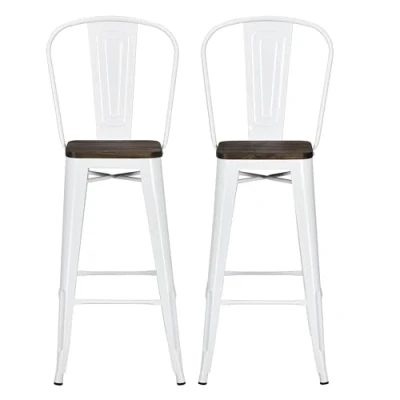 Industrial design with distressed wood seat and distressed metal frame. Sold in a set of 2. Compact and lightweight. This product is designed for home and commercial use. Perfect for restaurants, cafés, and more. Ships in one box and it requires minimal assembly.