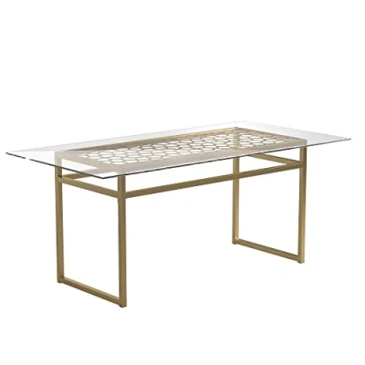Glass top dining table with artistic cut out detailing that comfortably sits 6 people. Clear tempered glass with metal base in a gold finish. Pair with the rest of the Juliette collection. Ships in two boxes. Quick and easy assembly required.