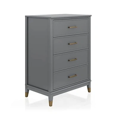 Add trendy storage to your bedroom with the CosmoLiving by Cosmopolitan Westerleigh 4 Drawer Dresser The 4 spacious drawers allows you to keep any size item stored away Clean white, edgy dark gray, or matte black finish with gold accents adds a sophisticated touch to your bedroom Made of painted MDF and wood for a sturdy build without the high price tag. 1 year limited warranty Gold drawer pulls and painted feet give the Dresser a chic and modern look your guests are sure to talk about