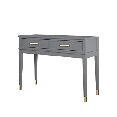 Add trendy storage to your living room with the CosmoLiving by Cosmopolitan Westerleigh Console Table Display all of your Insta-worthy shots on the table top and storage away your essentials in the 2 drawers. 1 year limited warranty Assembled dimensions: 29.8”H x 41.1”W x 15.6”D. Weight limit: 50 lbs. Clean white, edgy dark gray, or matte black finish with gold accents adds a sophisticated touch to your room Made of painted MDF and wood for a sturdy build without the high price tag Gold hardware and painted feet give the table a chic and modern look your guests are sure to talk about