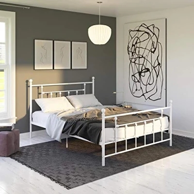 Sturdy metal frame Modern design with Victorian style finial detailing Available in twin, full queen and king size, white, gold, millennial pink or reflective bronze metal Accommodates any standard queen size mattress, sold separately