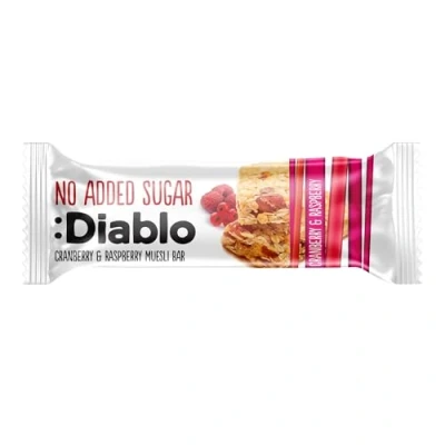 Breakfast Bar with No Added SugarBrighten up your morning and put a spring in your step with this oat-y "Cranberry & Raspberry" muesli bar, packed full of fruity flavour, minus the sugar. It works as a brilliant option whenever you're on the go and in need of a quick pick-me-up. Toasted and chewy, this humble snack bar has been hand-crafted to instantly energise and uplift you in your moment of need!BERRY EXTRAVAGANZABrighten up your day with this berry extravaganza! The combo of fruit and oats is always a winner first thing in the morning. Enjoy these bars on their own or, if you’re feeling adventurous, substitute your granola with them and sprinkle some on top of your Greek yoghurt.NO ADDED SUGARWhile Diablo avoids added sugar, the brand certainly does not avoid sweetness and uses only the most natural, tangiest sweeteners: maltitol and stevia. They're used as an alternative to sugar and are both as natural as they come—a dream come true for those looking to cut down on their sugar intake!PERFECT GIFT FOR ANY OCCASIONThis scrumptious muesli bar is the perfect way to say pretty much anything! "Happy birthday", "I love you", "Merry Christmas"... and even "I’m sorry". Whoever you gift this to will be eternally grateful that you brought it into their lives.Ingredients: OAT flakes 26%, sweetener: maltitol, extruded cereal 15% (WHEAT flour, rice flour, maize flour, salt), cranberries 13% (cranberries 65%, sunflower oil, elderberry concentrate, acidity regulator: citric acid), WHEAT flakes 6%, maltodextrin, raisins 2.5% (raisins, sunflower oil), palm fat, rapeseed oil, raspberry concentrate 1%, corn starch, humectant: glycerol, emulsifier: SOY lecithin, acidity regulator: citric acid, salt, flavourings, vitamins: folic acid, vitamin D, mineral: iron. MAY CONTAIN VARIOUS NUTS, PEANUTS, SESAME, SULPHUR DIOXIDE, MILK AND EGGS. EXCESSIVE CONSUMPTION MAY PRODUCE A LAXATIVE EFFECT.Storage conditions: store in a dry, cool place.*****"Diablo Sugar Free" lives for empowered decisions—none more so than those concerning sweet treats. The company doesn’t believe that more than five million people suffering from diabetes should be prevented from acting on human impulse and restrain from a delicious snack. That’s why they've created their "Sugar Free" and "No Added Sugar" goodies! Only the finest ingredients are used to produce these luxury products, and their sweetness is sourced from natural plants. You won't regret the day you've laid your eyes on these mouth-watering treats for the first time...