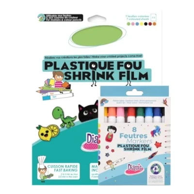 DIAM'S Crazy Plastic Kit, 7 Heat Shrink Sheets of Bright Colours, A4, 8 Coloured Felt Pens, Accessories Included