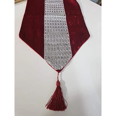 Diamante Velvet Table Runner Dining mat Tasselled Edges Decor 200cm (Red, x 32cm)