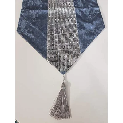 Diamante Velvet Table Runner Dining mat Tasselled Edges Decor 200cm (Silver, x 32cm)