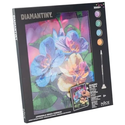 DIAMANTINY LEVEL UP: This is the crystal art activity to create DIY mosaics, embossed, with colorful 3D gemstones. Available in the QUADRO version Orchid to bud. TECHNIQUE: to decorate the mosaic in the shape of a canvas orchid to hang you must use the technique "crystal art, color with numbers", applying the gems to the numbers. The instruction sheet guides you through the application. FUNCTION: This activity is very simple and relaxing. Helps children and young people develop dexterity, coordination and concentration. CONTENTS: The set contains 1 picture of 32 x 30 cm with adhesive base and colour guide, 3000+ coloured crystals, 1 binder tray, 1 pen with which to apply them and 1 square of wax. Recommended age: 8+, Manufacturer: Nice SRL