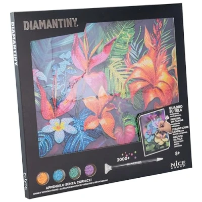 DIAMANTINY LEVEL UP: This is the crystal art activity to create DIY mosaics, embossed, with colorful 3D gemstones. Available in QUADRO Tropical Flowers to gemstone. TECHNIQUE: to decorate the mosaic in the shape of a canvas painting tropical flowers to hang you must use the technique "crystal art, color by numbers", applying the gems to the numbers. The instruction sheet guides you through the application. FUNCTION: This activity is very simple and relaxing. Helps children and young people develop dexterity, coordination and concentration. CONTENTS: The set contains 1 picture of 32 x 30 cm with adhesive base and colour guide, 3000+ coloured crystals, 1 binder tray, 1 pen with which to apply them and 1 square of wax. Recommended age: 8+, Manufacturer: Nice SRL