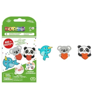 Kids love it! Sparkling sticker set with the extra sparkling stones from the original Diamond Dotz. Cool designs for beginners and children: Narwhal, Panda and Koala Craft set fans pay attention! With the coveted creative technique, just like painting by numbers, the diamond-like plastic stones are applied piece by piece. Don't they sparkle beautifully? High quality fabric and extra fast adhesive 10% more stones are always included than necessary for the motifs if they are lost. Creative set ideal for children aged 6 and over All sets include: plastic mosaic stones - cut like real diamonds, pen for applying the stones, sufficient wax, a bowl and instructions (English language not guaranteed). As easy as painting by numbers Dotzies Diamond Painting with 3 Colourful Stickers "Love You Chums" to Fill Yourself for Girls and Boys from 6 Years, Approx. 9 x 8 cm, item number: DTZ12.037, EAN: 4895225927555 - ready to dot?, Manufacturer: Needleart World (Hongkong) Ltd.