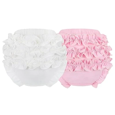 100% Cotton Machine Wash Material:Bloomer diaper covers made of cotton are soft and comfortable,reusable toddler diapers are perfect for babies' sensitive skin Design:The ruffled design makes the little guy look more cute and has no pressure to wear everyday.Bloomers with elastic waist and leg design, suitable for active little babies Choice: Sweet and cute style bloomers in a variety of colors and sizes to complement your baby's look like a little angel and also the best gift for your baby Size:Waist size of 80 fits 0-6 months; 90 fits 6-12 months; 100 fits 12-24 months.Please measure carefully when choosing a size, if your baby is developing faster, please choose a larger size 24-Hour Service: We are very confident in the quality of our products. If you find a quality problem with our products, just contact us and we will try our best to solve your problem.