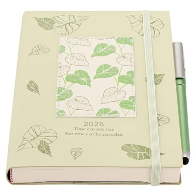 Diary 2026 Page a Day - Diary 2026 Runs Jan 2026 to Dec 2026, Diary 2026 day per page with hourly planner (weekend may on one page). featuring 12 months monthly and 52week diary for easy planning.reduce clutter and make progress every day. the 25 diary A5 day to view is the perfect choice for organizing your life. Every Day Planner 2026 -multi-functional ,You can make any plans, such as year goals,monthly and daily plans.Before Daily planner, you can make a approx plan for whole year. Overview of all holidays included.To help you efficiently manage the work and life. Time Planning : Covers 12 months from January 2026 to December 2026, with monthly calendar for an overview of the planning,Detailed day per page layout with time slots from 8am to 8pm, Includes monthly cards, reminder for important dates and notes section for each day,ideal for organizing appointments and daily schedules. Practical Size : A5 size (14.8 x 21 cm) perfect for carrying in your handbag or backpack, with plenty of space for writing. Elegant Design: Minimalist style green leaf pattern cover, the faux leather is smooth and pleasant to touch with elastic closure and built-in 3 bookmark,inner pocket.the diary use of premium 80 GSM acid-free ivory colour paper,comfortable to the touch and ink resistant, ideal gift for planners, students or professionals.