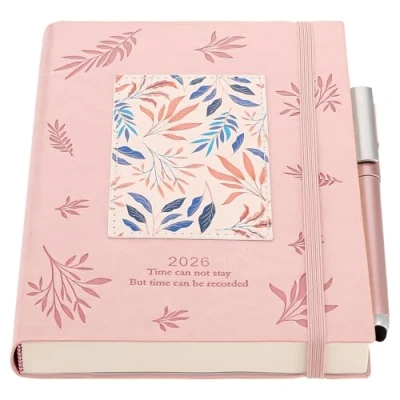 Diary 2026 Page a Day - 2026 Diary Runs Jan 2025 to Dec 2026, day per page diary with hourly planner (weekend may on one page). featuring 12 months monthly and 52week diary for easy planning.reduce clutter and make progress every day. the 26 diary A5 day to view is the perfect choice for organizing your life. Every Day Planner 2026 -multi-functional ,You can make any plans, such as year goals,monthly and daily plans.Before Daily planner, you can make a approx plan for whole year. Overview of all holidays included.To help you efficiently manage the work and life. Time Planning : Covers 12 months from January 2026 to December 2026, with monthly calendar for an overview of the planning,Detailed day per page layout with time slots from 8am to 8pm, Includes monthly cards, reminder for important dates and notes section for each day,ideal for organizing appointments and daily schedules Practical Size : A5 size (14.8 x 21 cm) perfect for carrying in your handbag or backpack, with plenty of space for writing. Elegant Design: Minimalist style pink leaf pattern cover, the faux leather is smooth and pleasant to touch with elastic closure and built-in 3 bookmark,inner pocket.the diary use of premium 80 GSM acid-free ivory colour paper,comfortable to the touch and ink resistant, ideal gift for planners, students or professionals.
