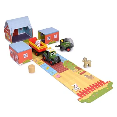 Nanu, what drives there? - The Fendt toy tractor with light and sound has a real hay baler in tow! In it, the hay bale rotates and can be ejected at the touch of a button. Lovingly designed - In addition to the tractor, the farm set includes an animal pendant with hinged ramp, a hay baler with hay bales, cute animals (cow and horse) and a cardboard house. From 12 months - load trailers, transport animals, press hay bales: playing with the vehicle and accessories promotes fine motor skills and is suitable for babies and toddlers from 1 year old. Safe fun – made for children's hands: the farm toy is easy to grip, colour-fast, saliva-proof, without small parts, rounded, easy to push About Dickie Toys The vehicle brand for children. We always have one goal in mind: to put a smile on children's faces. Simply unpack and off you go! What components are included in the scope of the product: ABC Fendti Farm Life Set, Manufacturer: Dickie Toys
