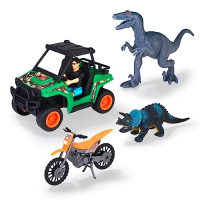 Extensive toy set – with his UTV vehicle and motocross bike in his luggage, the ranger picks up the track: can he track the two dinosaurs - a Raptor and a Triceratops? Dino car with pull-back motor - Simply pull back and go: The off-road vehicle (12 cm) has a pull-back motor, a hinged roof and a bracket for the trail motorcycle. Ideal as a gift - Gigantic prehistoric animals and fast-paced speedsters combined in one set: Dinos and cars are an unbeatable toy combination for boys and girls. Suitable for children over 3 years old. Carefree fun - Immerse yourself in the world of giant lizards and off-road adventures: high-quality materials and strict quality controls ensure carefree and long playing pleasure. Dickie Toys - The vehicle brand for children! Small racers, big racers: We always have one goal in mind: to put a smile on the face of children. Simply unpack and off you go!, Manufacturer: Dickie Toys