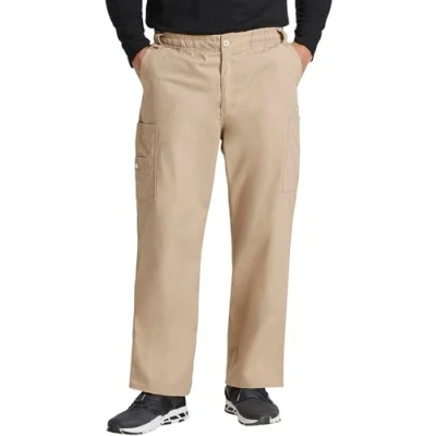 Dickies logo twill tape on inside back waistband Dickies exterior logo at the right cargo pocket STORAGE AND STYLE - These mens scrub pants feature a total of seven pockets: two roomy front pockets, two cargo pockets (left with interior pocket, right with layered pocket) and a back pocket; Right cargo and back pocket have hook-and-loop closure SOFT AND COMFORTABLE - Our EDS Signature mens work pants are made from a cotton and polyester blend brushed poplin fabric that is breathable, comfortable and durable to withstand wear after wear, wash after wash; These are comfy pants!