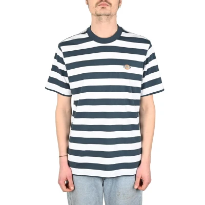 * The Dickies Rivergrove tee is a comfortable fitting, short-sleeved t-shirt, featuring a printed graphic on the left of the chest * Navy and white striped cotton construction with subtle dickies details on the chest * Dickies branded woven clamp label on the hem * Materials: 100% Cotton * Model is 5'10" tall and of a slim build wearing a Medium * Fit: Relaxed, we recommend taking your usual size