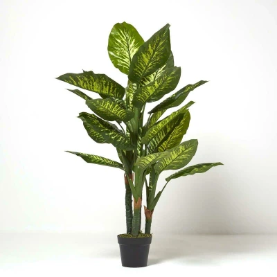 Tall artificial Dumb Cane plant from Homescapes, Dieffenbachia tree set inside a black pot. Measuring approximately 150 cm tall. Colour: Green. Luscious and lifelike variegated tropical plant that will add a touch of greenery to your home, living space or office. With long and large multiple real-touch green leaves and wood effect stem. This faux artificial plant is crafted from a special UV protected silk-like polyester, ensuring that it looks and feels real and lifelike. On arrival, please take the time to style your plant to your desired look. Carefully handcrafted by skilled experts, Homescapes' artificial plants look just like the real thing and there is no need for constant maintenance or watering. Faux plants are potted in standard plastic pots, we recommend potting your artificial plant into decorative pots or planters to compliment your home decor. Homescapes are a leading manufacturer of artificial plants, trees and flowers for the home and office. Choose from a wide selection of faux plants and trees to add a tropical feel to your home.