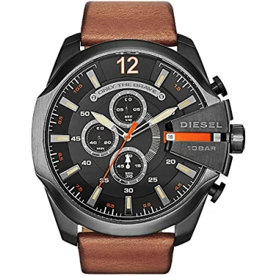 This Diesel Mega Chief Chronograph Watch for Men is the perfect timepiece to wear or to gift. It's Black 51 mm Round case combined with the comfortable Brown Leather watch band will ensure you enjoy this stunning timepiece without any compromise. Operated by a high quality Quartz movement and water resistant to 10 bars, your watch will keep ticking. This sporty and fashionable watch gives you a unique feeling in every outfit! -The watch has a calendar function: Date, Stop Watch, Luminous Hands, Luminous Numbers High quality 21 cm length and 26 mm width Brown Leather strap with a Buckle Case diameter: 51 mm,case thickness: 14 mm, case colour: Black and dial colour: Black