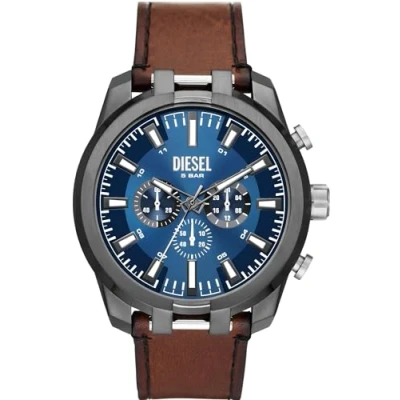 51mm case, 26mm band width, mineral crystal, Quartz movement with chronograph analogue display, imported Round stainless steel case, with a blue dial Brown, leather band Water resistant up to 50m, Wearable while swimming in shallow water