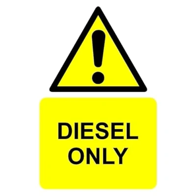 Diesel only safety sign. Self adhesive sticker. Printed using the latest digital technology and laminated for extra durability. Remove backing film and apply to dry, smooth, oil free surface. All signs come with a 5-year warranty. All our signs are UV resistant meaning they will not fade in sunlight. Our vinyl stickers are temperature resistant from -40°C to +80°C.