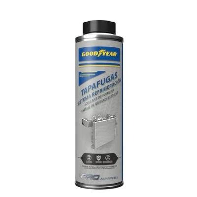 ManoManoThe Goodyear Pro Additives leak sealant for refrigeration systems is designed to effectively seal small cracks and perforations in cooling systems. Its unique formulation contains suspended surfactants that do not alter the color or appearance of antifreeze. This product protects the cooling circuit by sealing leaks and prevents the formation of rust and scale deposits. It is compatible with all types of coolant fluids, including organic antifreezes (OAT), and enhances engine heating and cooling performance. This sealant is suitable for all vehicle cooling and heating systems, with or without a water filter, and is compatible with both aluminum and plastic radiators. It is also compatible with all common coolant and antifreeze additives. Instructions for use: Shake vigorously before use. Start the engine and turn on the heating. Add the product when the engine is warm and let it run for at least 10 minutes until the thermostat opens. Technical features: - Volume: 300 ml - Weight: 390