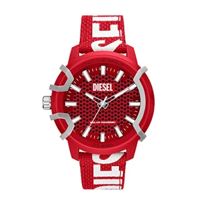 48mm case, 22mm band width, mineral crystal, Quartz movement with three-hand solar-powered analog display, imported. Round castor oil case, with a red dial. Red, 100% rPET strap. Water resistant up to 50m: Wearable while swimming in shallow water.