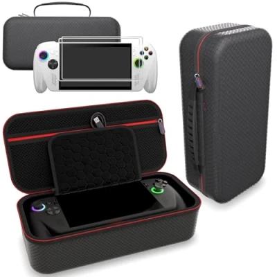 Precision Fit for ROG Ally & Ally X: Custom moulded insert with soft lining securely holds the 2025 ROG Xbox Ally and Ally X handhelds, preventing movement and impact during travel. Screen Protection & Storage: 2 x 9H tempered glass screen protectors included. The case features an hexagonal air-cushioned flap shields the display and features 5 integrated memory card slots; secured with Velcro for extra safety so your console can't move or fall out when opening the case. Organized Accessory Storage: Separate compartment below for charger, cables, or power bank—protected by a divider to prevent scratches on your console. Includes mesh pocket for earphones and small accessories. Durable 900D Nylon Exterior: Splash- and scratch-resistant shell with stylish red zippers and molded pulls; includes a strong, comfortable carry handle. Multifunctional Design: Converts into a convenient stand for gaming with an X box controller.