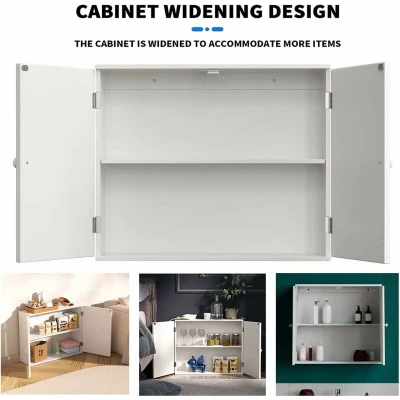 General description This bathroom wall cabinet is crafted from high-quality MDF material, featuring a smooth white finish that adds a stylish and modern touch to your bathroom decor. It is lightweight, waterproof, fire-retardant, moisture-proof, and free from BPA and formaldehyde, ensuring it is safe, eco-friendly, and easy to clean. The cabinet offers ample storage space and is designed for both wall-mounted and floor-standing use. Technical specifications Product Type: Bathroom wall/floor storage cabinet with 2 doors Product Size: 23.6" (L) x 6" (W) x 20" (H) Product Weight: 8.26 kg (18.2 lbs) Weight Limit: 5 kg per shelf Color: White Material: MDF Finish: Powder Coated Paint Installation Can be assembled as wall-mounted or floor-standing Includes wall plugs for mounting Assembly requires a screwdriver and takes approximately 5-10 minutes Assembly instruction sheet is included Usage Ideal for storing bathroom supplies, kitchen items, or decorative pieces in various rooms Adjustable