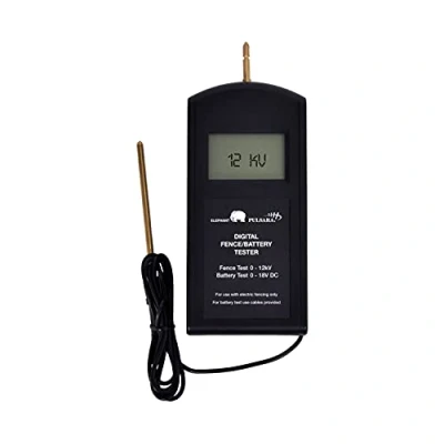 A digital fence tester and battery tester in one. Measuring an electric fence is normally between 1000 and 12,000 volts and can be read in KV. Voltages measured above 12,000V are displayed as ‘HI’. Main Features - Shows voltage in KV - Easy to use This digital voltmeter can also test battery voltage. The measurement range is between 6 and 19,9 Volts The voltmeter is switching itself on and off when testing the battery. All required test probes and a soft case are included. Please note: This device is powered by one 9V battery (not included).