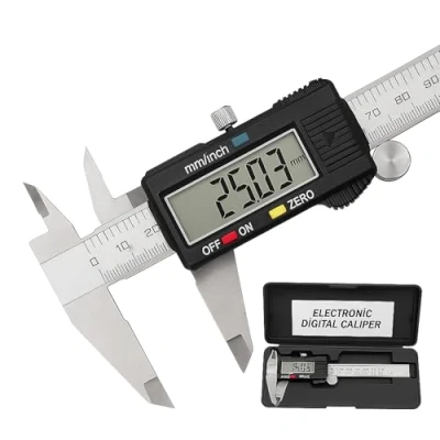 Waterproof & Stainless Steel Material – This digital caliper is made from high-quality stainless steel with a polished finish for rust and water resistance, ensuring durability and longevity Easy Switch from Inch to MM – The 6-inch digital caliper features a one-button operation for effortless switching between inch and mm units, offering convenience for all measurement tasks Accurate Measuring Tool – This digital micrometer provides a measurement range of 0-6" (150mm) with a resolution of 0.0004" (0.01mm) and accuracy of 0.0007" (0.02mm) for precise results Versatile Measurement Functions – The digital vernier caliper measures inside, outside, depth, and step dimensions, featuring smooth sliding action and a zero-setting function for accurate measurements Wide Application for Professionals & Hobbyists – Ideal for jewelers, machinists, woodworkers, automotive mechanics, and DIY enthusiasts, this digital caliper is an essential tool for any toolbox or workshop