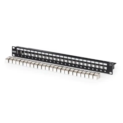 DIGITUS patch panel set 24 ports with 24x Keystone modules DN 93615 500 MHz CAT 6A rack mounting in 19 inch network cabinet 1U black