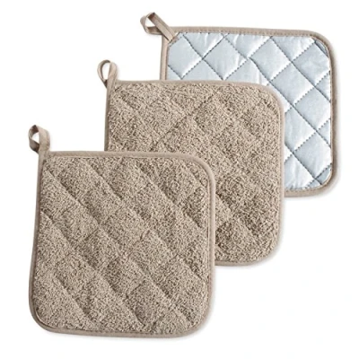 QUALITY PRODUCT: Our pot holders and oven mitt sets are 100% cotton, quilted and padded adding durability and are heat resistant; Use to remove hot pots and pans from the oven, a baking dish from the microwave oven and cooking on your stove top HANGING LOOP FOR EASY ACCESS: Set of 3 pot holders, each measure 7 x 7 inch square; Use as hot pads for hot dishes, coffee pot, hot pot, cast iron or cooking pot. Protect counter tops from scratches, place mat under heavy cast iron set PROTECT YOU FROM HEAT: Heat resistant up to 400 degrees allowing safe removal of baking dishes and cast iron from the oven and hot pots from the stove; Stay safe - Do not use potholders or oven mitts in a hot oven or over an open flame GREAT GIFT CHOICE: Pot holders, hot pads and oven mitts are apartment essentials, make great hostess gifts, housewarming gifts and camping accessories; Pair with cooking utensils, kitchen utensil set and dish towels for a fun and thoughtful gift CARE TIPS: Pot holders and oven mitts are machine washable, durable and long lasting with daily use; Wash in Cold Water on Gentle Cycle & Tumble Dry Low; So many color options make coordination with kitchen accessories and dish towels easy and fun