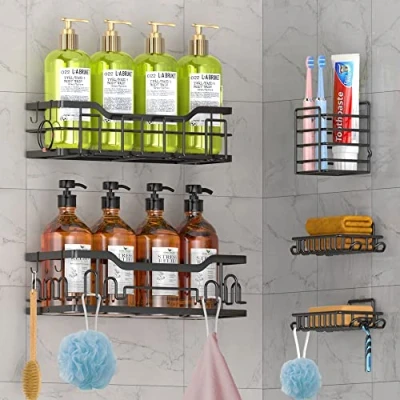 Large Capacity and Large Space - Shower Caddy: 5-Pack shower shelves include 2 shower caddy、2 soap holders、1 toothbrush holder and 7 adhesives. Give all your shampoos, conditioners, soaps a place to storage. Shower organizer can even be used in bathroom, kitchen, tool room, etc, meet your different needs. Rust-Proof and Durable Thicker - Shower Shelf: The corner shower caddy is made of SUS 304 stainless steel, coated with rustproof chrome, smoother surface, thickened frame more durable. The open bottom hollow panel design not stagnant water, which prevent mucky buildup or soap scum. Strong Adhesion, Firm and Not Shaking - Shower Shelves: The strong adhesive shower shelf provide super stability, not disrupted by water but stays strong. Each shower rack can load at least 6 full-size bottles(Up to 40lbs)for a long time. Easy Installation, Adjustable Layer Distance - Shower Organizer: The hanging shower caddy adhesive offers simple traceless installation, simply apply the adhesive to the wall and attach the shelves for shower without any tools and drilling .No damage to the walls. Keep Your Bathroom in Order - Shower Shelf for Inside Shower: The hanging shower shelves are a great way to keep your bathroom from any clutter. Shower corner shelf also includes hooks for washcloths and sponges, a towel bar to hang your towels.